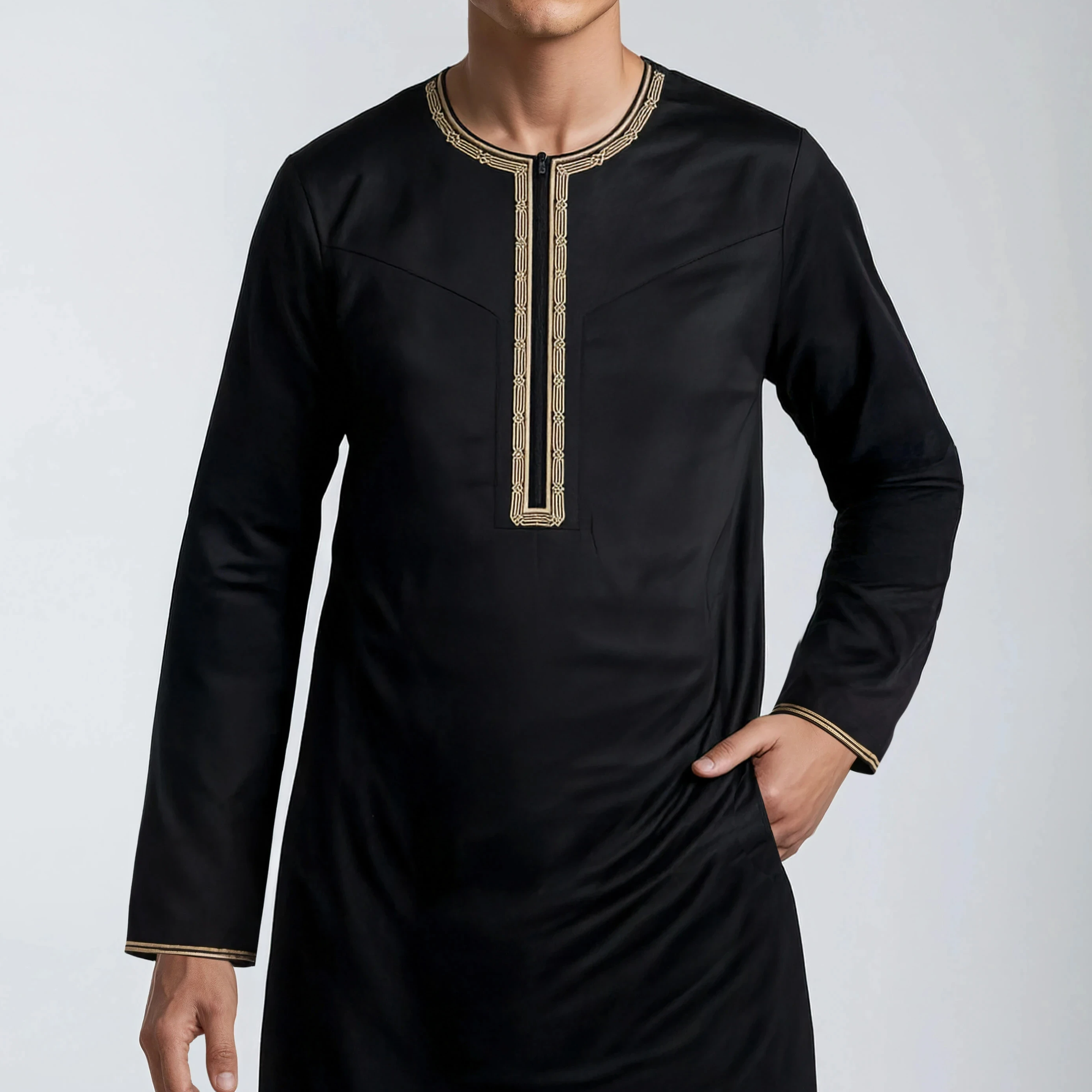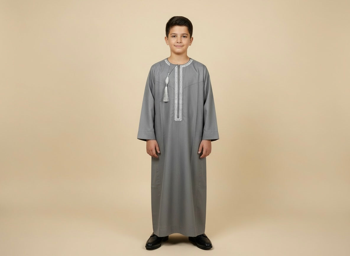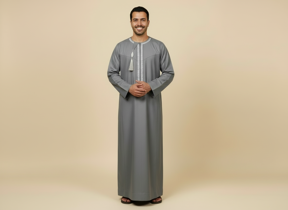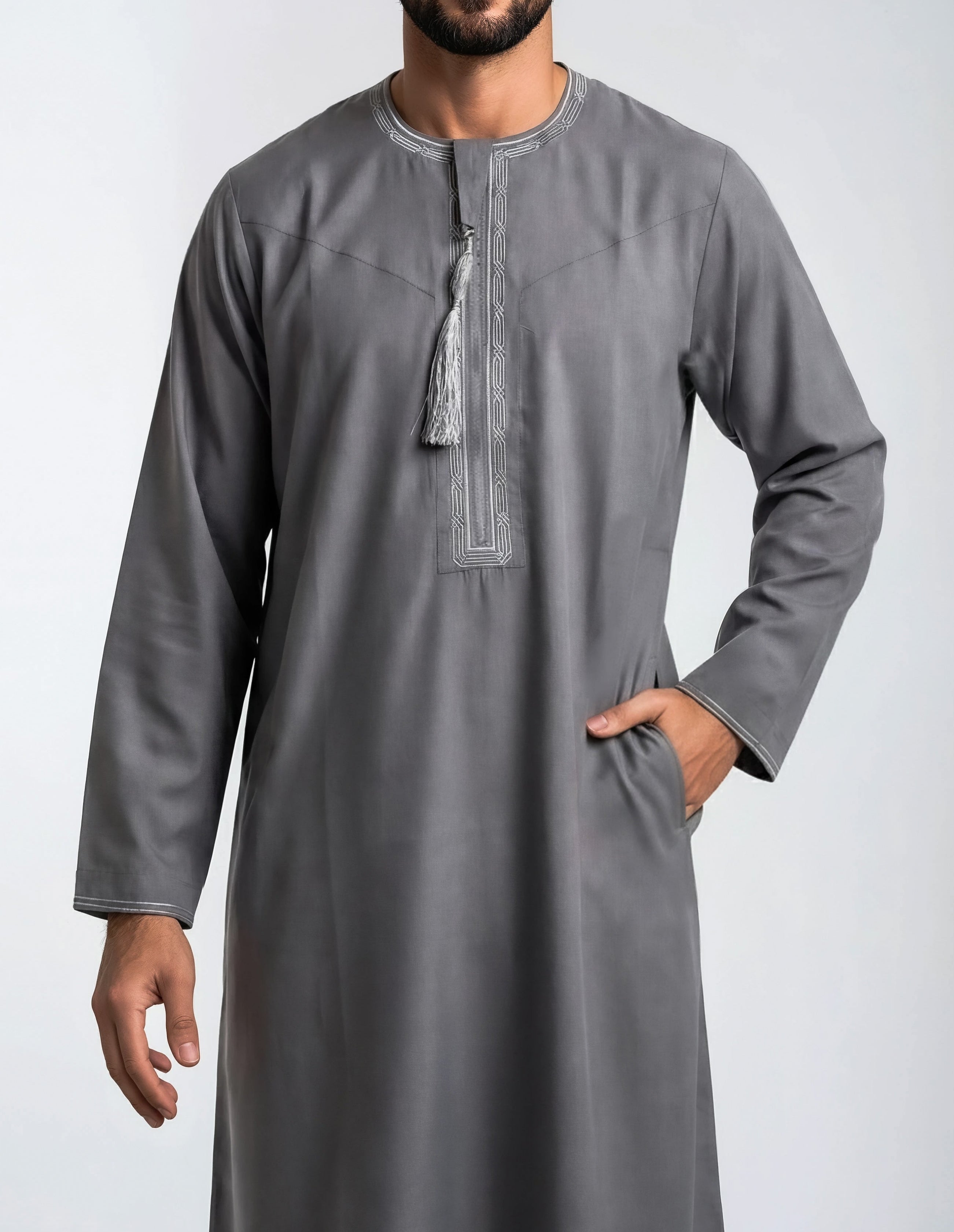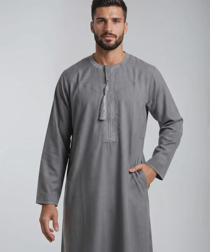 Discover authentic Omani tradition in this expertly tailored thobe, available in both men's and children's sizes. The spacious cut ensures freedom of movement while upholding modest design principles central to traditional wear. Its removable tassel offers adaptability for different settings, seamlessly transitioning from daily use to formal occasions. Built on timeless heritage aesthetics, this garment delivers genuine comfort without compromising on the cultural significance and practical elegance that define quality traditional dress.